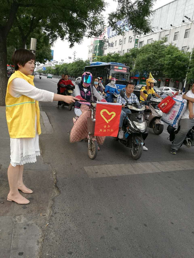 随着德城区创建全国文明城市以及建设协调发展示范区工作的推进,自5月8日开始,我中心文明交通劝导员志愿者身着志愿者服装,举着劝导旗,站在解放路与三八路交叉路口,每周一和周四早晚的高峰期,积极落实劝导行人遵守交通规定,文明出行的活动。在岗期间,文明交通劝导员志愿者们按时到岗,文明劝导,坚守岗位,以实际行动践行“我文明,德州文明,文明出行,从我做起”。